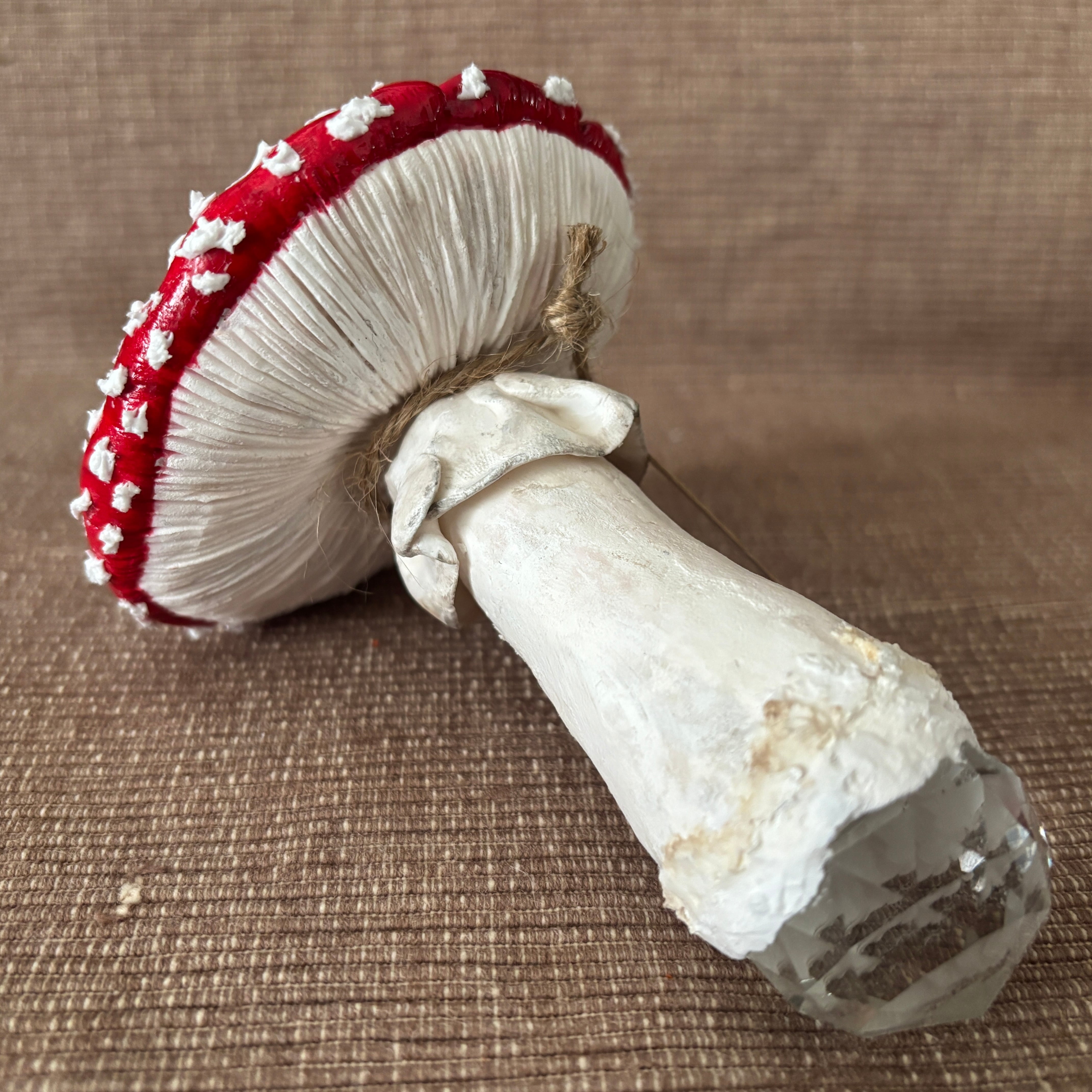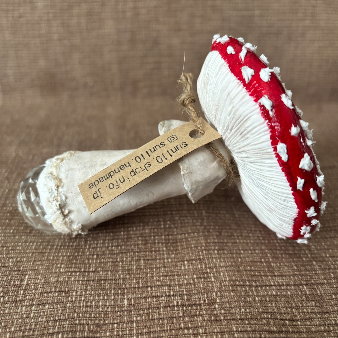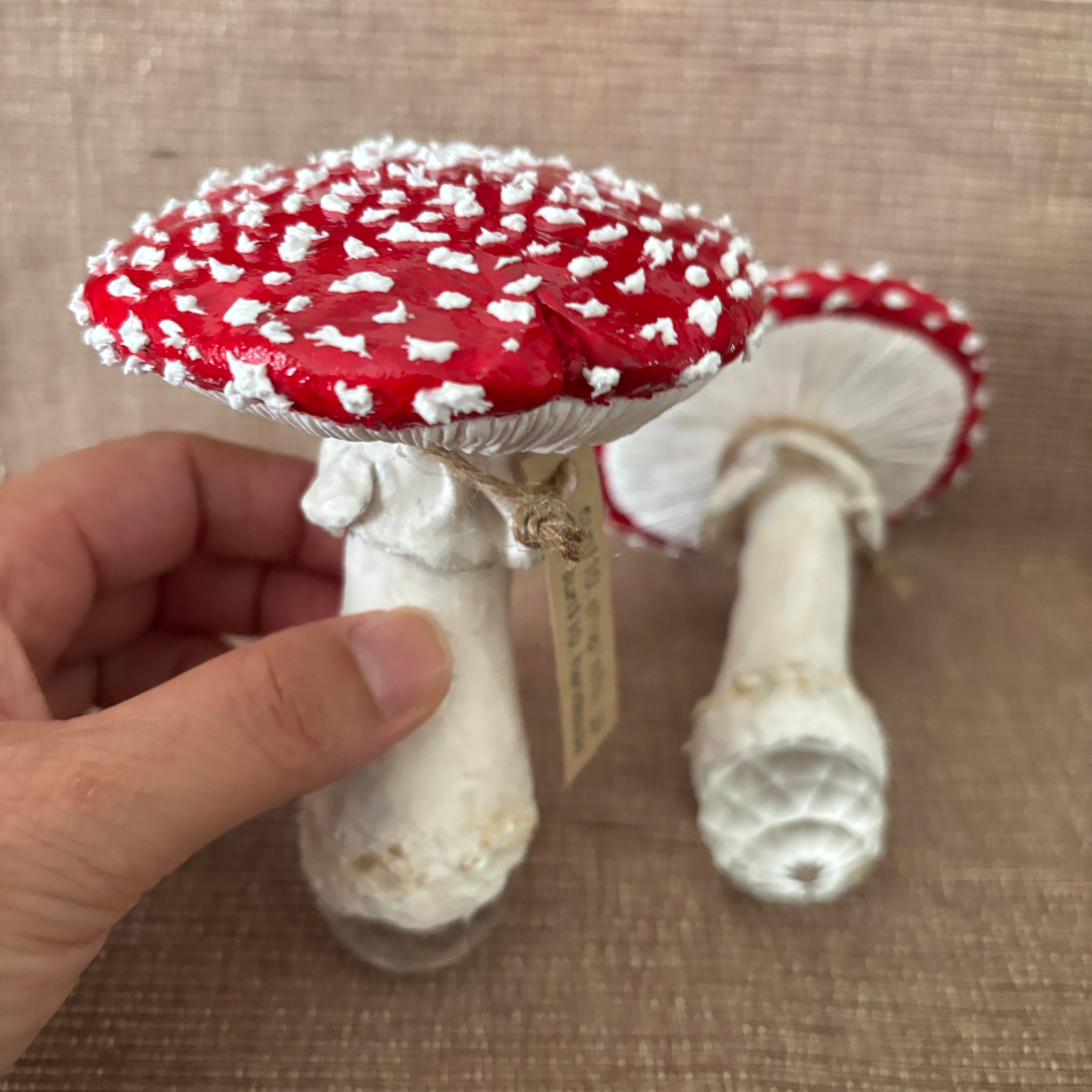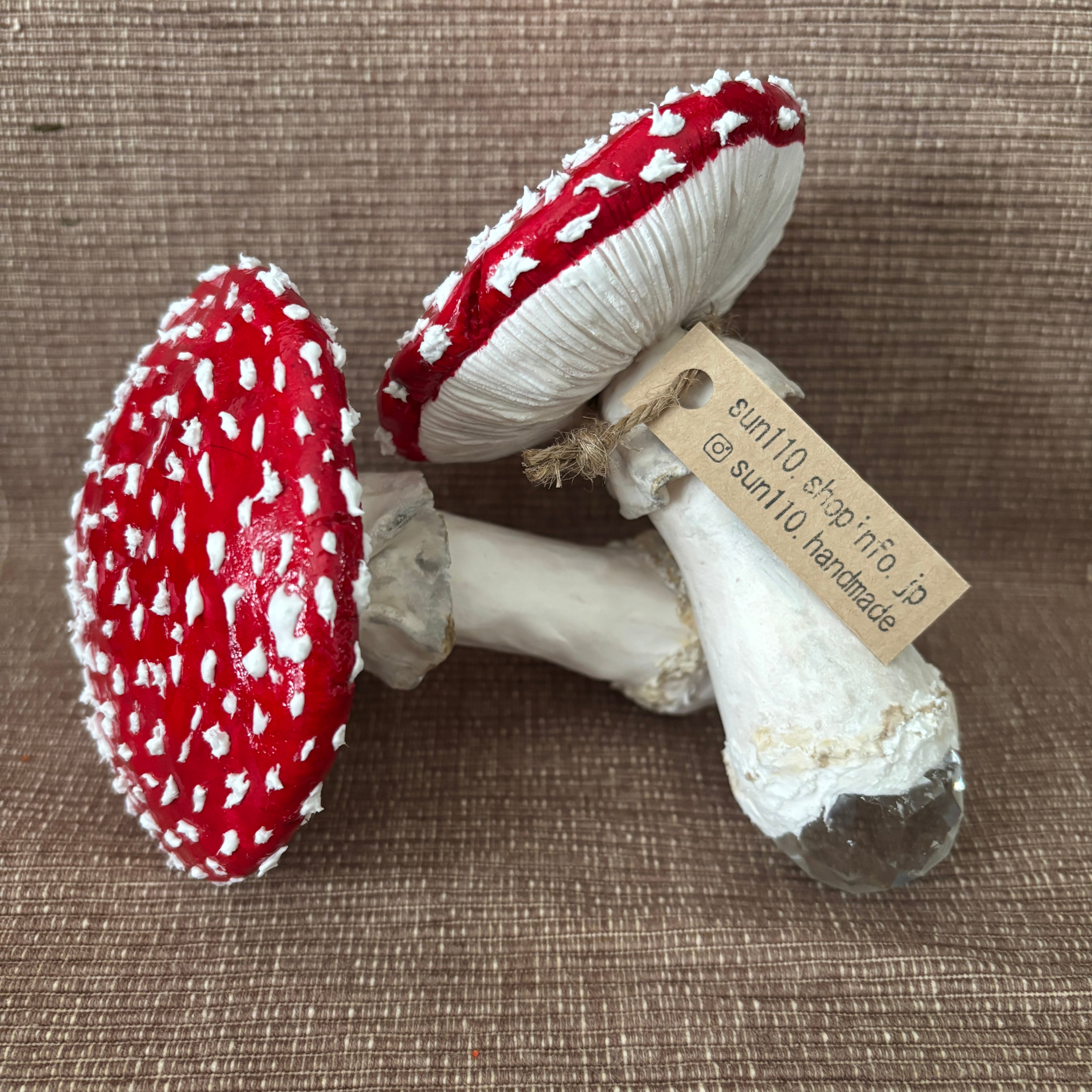 キノコには傘とヒダには異なる種類の軽量粘土を使い、配合も変えて質感を出しました。白い点々も粘土でひとつひとつ丁寧に手作業で付けています。型は使わずすべて手作業で成形しているため、自然のキノコのようなリアルさをお楽しみいただけます。