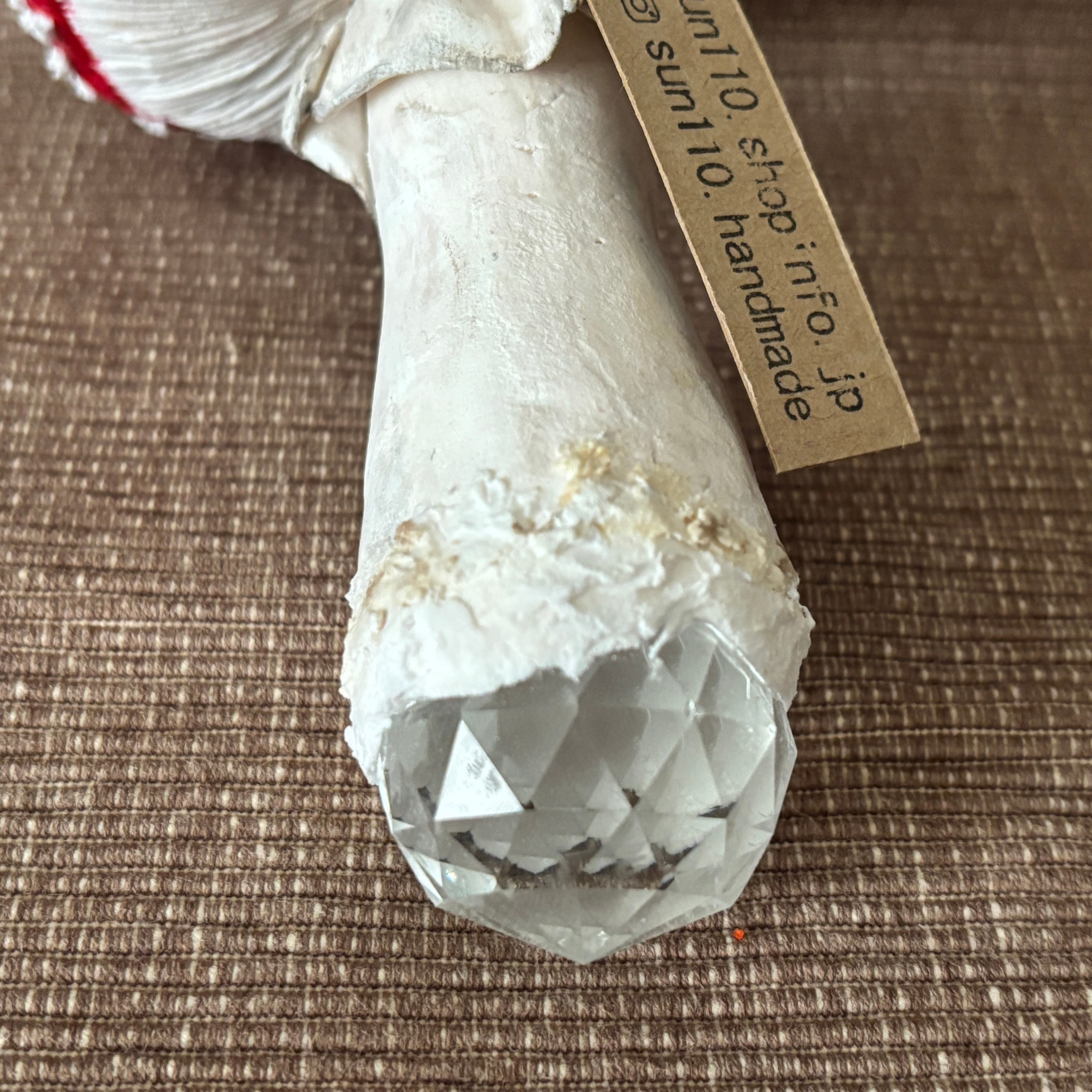 キノコの下にクリスタルパーツをあしらっており、光が当たるとキラキラと美しく輝きます。